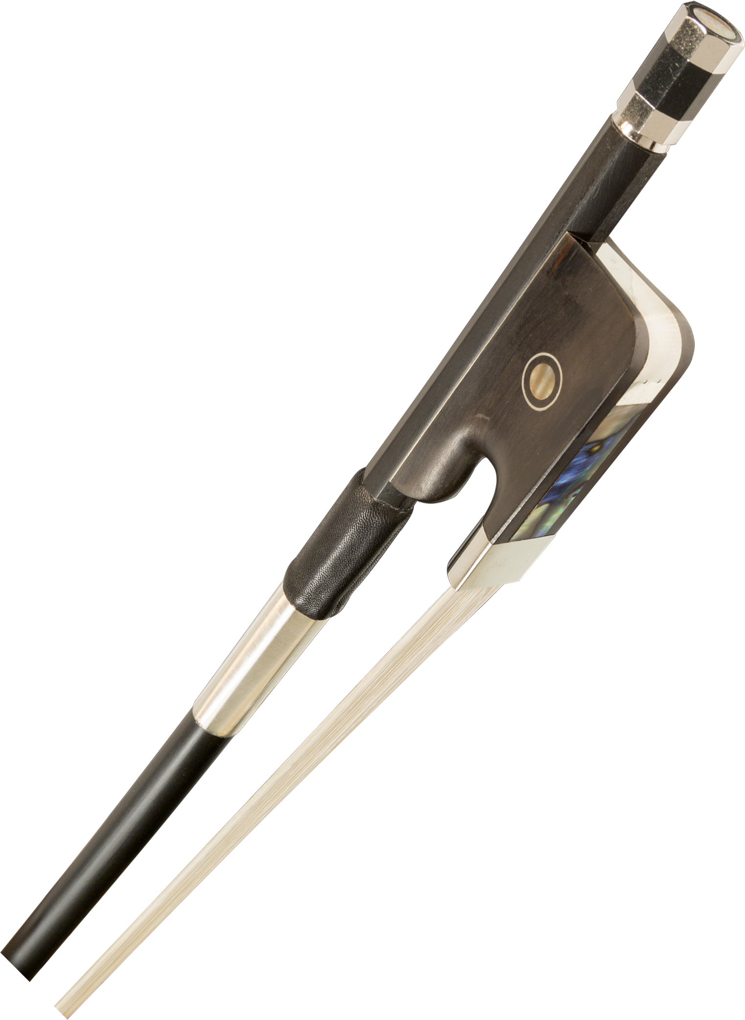 Black composite stick with wire grip, fully lined ebony frog with Parisian eye, and solid button. German and French model bass, 3/4 - 1/8 sizes.
