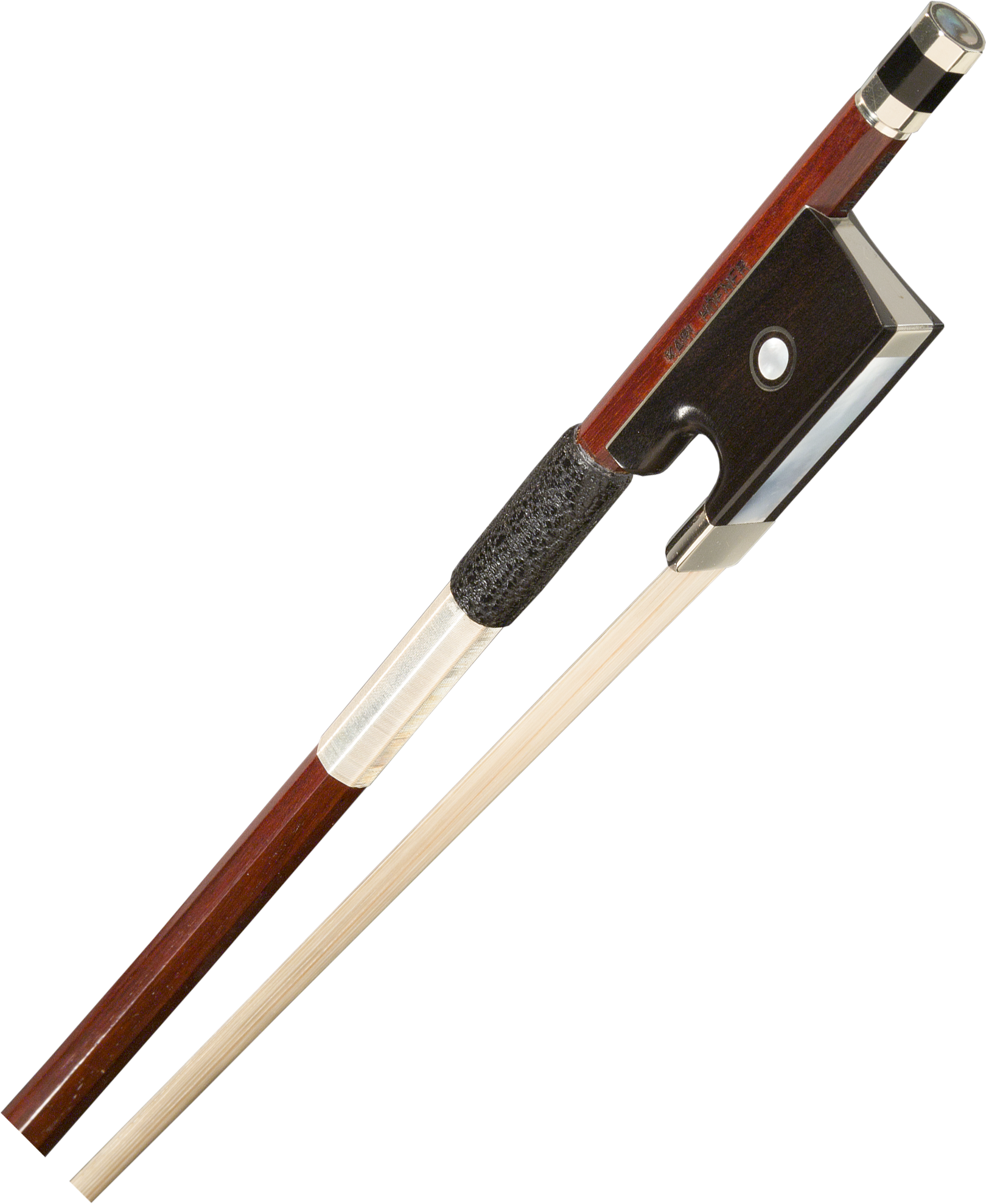 KARL HOFNER. Octagon "AA" quality Pernambuco stick. Nickel silver mounted ebony frog with Parisian eye, Chevreaux leather lapping with sterling silver wire winding. Three-part button. Mammoth ivory tip. 4/4.